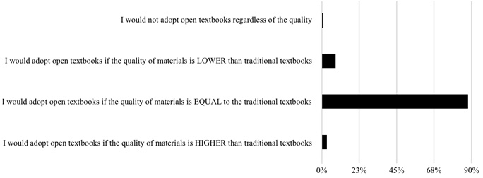 Perception of quality and adoption intentions. We also examined whether the quality of open textbooks would potentially cause faculty members to adopt them. Ninety one percent of faculty respondents would adopt open textbooks when quality was at least equal to traditional textbooks, which is well aligned with the previous finding on faculty intention to continue using open textbooks (See Figure 7).