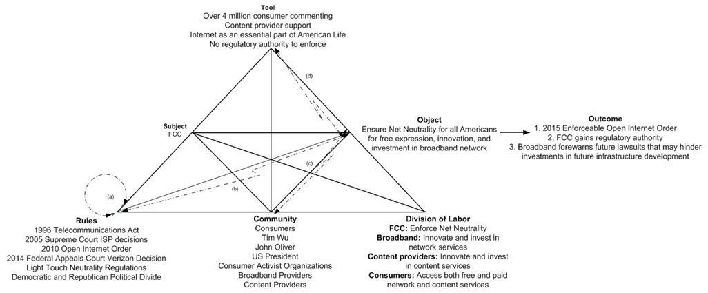 In our analysis, we found that the historical events became part of the rules element because how they acted defined how net neutrality could be or could not be socially negotiated. The events that became part of the rules included the Telecommunications Act, Supreme Court Rulings, and FCC rules. There were two additional informal rules that we found took a critical role in the FCC activity. They were the light touch neutrality regulations and the political divide between the Democratic and Republican parties that had significant influence on the FCC membership and decision-making. The community with interest in net neutrality was a large group including consumers, Tim Wu, John Oliver, the US President, consumer activist groups, broadband providers, and content providers. The division of labor was another complex component in the FCC activity where there were distinctly different roles played by the FCC, broadband providers, content providers, and consumers.