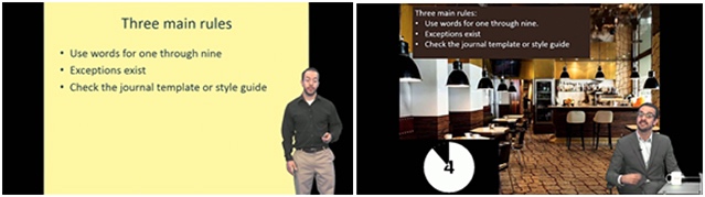For the control group, the video series was prepared in a straightforward style with only one lecturer and no summaries, as shown in Figure 1. For the videos prepared for the "summaries only" group, all lecturing and summaries were delivered by the same instructor, as shown in Figure 2(a). The summaries were around 30 seconds in length and were shown at the middle and end of each video. In the mid- and end-point summaries, the lecturer would mention the main points from the first and second halves of each video, respectively. The video series provided to students in the "summaries with a guest lecturer" group contained more varied change-of-pace elements: each video contained mid and final summaries with identical content to those of the "summaries only" group, but the summaries were delivered by a guest lecturer who was also seated in a "coffee shop" setting projected in the background, as shown in Figure 2(b), rather than standing in front of PowerPoint slide contents, as in the videos of the "summaries only" group.