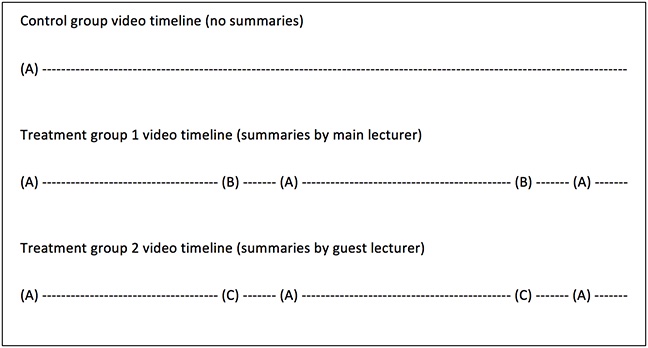 Kim et al. (2014) point out that increases in viewership and student lecture behaviors, such as pausing, seeking backwards and forward, and re-watching videos, occur during particularly unclear or interesting segments of a video. As evidence that the visual design of a video can affect the ability of students to understand the information covered, Kim et al. found, in their study, that 61% of such increased periods of viewership and lecture behaviors occurred during an abrupt change in the background, such as shifting from a slide view to a classroom view, and the researchers further suggest that video content creators refrain from including abrupt scene changes or excessive transitions, as these may cause student to feel confused or to lose the context. While we were unaware of this suggestion when designing the treatment videos and the present experiment, the aforementioned findings provide a plausible explanation for the reduced effectiveness of the videos in the "summaries with a guest lecturer" group compared to the "summaries only" group, and our findings seem to support those of Kim et al. (2014). While both of these groups contained mid- and end-point summaries of equal length (30 seconds each), only the "summaries with a guest lecturer" contained scene changes (from a slide background to a coffee shop setting and back again), as the "summaries only" group kept the same slide background throughout.