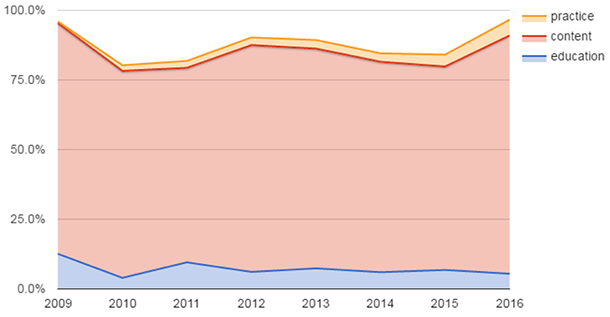 Second, we applied this same process to all tweets in the dataset generally, grouping tweets by the year in which they were authored and providing descriptive statistics of hashtag category frequencies. Results indicated that content remained the most prominent topical category by a wide margin across all years (77.7%) but that there had been a slow but steady increase in practice tweets from 2009-2016, with an average increase of 0.7% each year (cf. Figure 6).