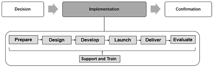 One imperative aspect investigated by this study was the actual implementation process of producing a MOOC as an instructor: "Implementation occurs when an individual puts an innovation into use. Until the implementation stage, the innovation-decision process has been a strictly mental exercise of thinking and deciding" (Rogers, 2003, p. 179). In the current study, the implementation process included all actions by instructors after the decision to offer a MOOC. In the conversations, six stages plus one cross-phase element were identified: prepare, design, develop, launch, deliver, evaluate, plus support and train (Figure 1).