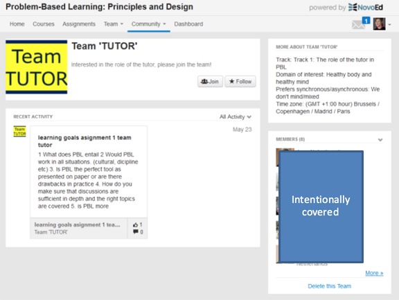 This study has revealed that it is possible for online, virtual teams to collaborate on learning tasks without extensive guidance, but this requires additional communication and technological skills and support. In the MOOC Problem-Based Learning: Principles and design. Students at the centre! most teams worked fully online. Self-composed teams usually shared a common interest or lived in the same area, but often team members did not know each other. It is surprising that the teams did not spend much time on introductions or getting to know each other. Apparently, the MOOC evoked a task-focused approach, possibly because of the strict timeline required for the completion of assignments.