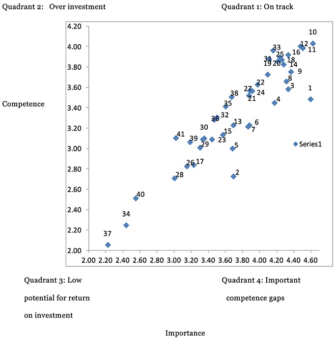 Previous studies often only determined the training gaps by comparing the means or, at most, standardised the scores by calculating the T-scores (Chang, Shen, & Liu, 2014). This study, however, used the T-scores to determine the size of the standardised competence gaps and also analysed the importance of these gaps (as was illustrated in Figure 1). Of specific importance is thus the significant competence gaps (Quadrant 4), which are also deemed important to address after standardisation.