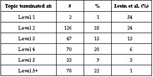 Persistence. Another measure of intensity, or the conference’s 'pull,' was found in the participants’ persistence in the interaction, shown by the level to which topics were pursued. The term level as used here means how many messages appeared in the “thread” of a discussion, from the first posting on the topic to the last. The level to which a topic had progressed was readily apparent to participants, as part of the structure of the transcript. Levels of posts appeared as follows in the transcript: