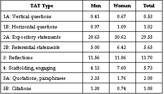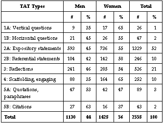 The frequency of each of the TAT types in this transcript is shown in Table 3. The number of sentences is shown for students’ postings only.