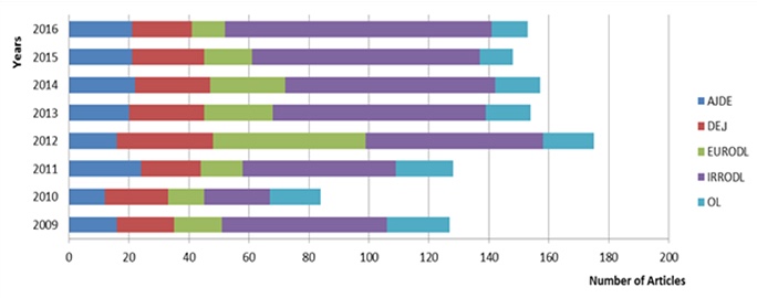 The research sampled articles published between 2009 and 2016 to reveal research trends in DE emerging from scholarly publishing in five popular journals: American Journal of Distance Education, Distance Education, European Journal of Open, Distance and E-Learning, The International Review of Research in Open and Distributed Learning, and Open Learning: The Journal of Open, Distance and e-Learning. The following criteria were taken into consideration in the selection of the relevant journals: