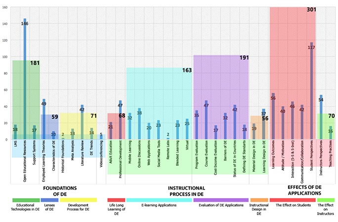 As an evolving interdisciplinary field, the DE field is attempting to conform to steady changes in technology and pedagogy. As educational change is inevitable and pertinent, we are endeavoring to discover and organize the most appropriate method for open learning and DE in the current learning environment. With the growing demands of instructors and learners, it is imperative to grasp trends and concerns of DE to keep up with these developments. As an evolving interdisciplinary field, DE is trying to conform to these steady changes. Accordingly, this study may pave the way to perceive and clarify recent DE dynamics through academic reports by supplying an inclusive silent evidence list in this field (Hodder, 1994). By making the research trends visible, research gaps can be located and future research can be planned to enable the shift. Understanding this shift may help instructional designers, instructors, or policymakers for short and medium term planning in this area.