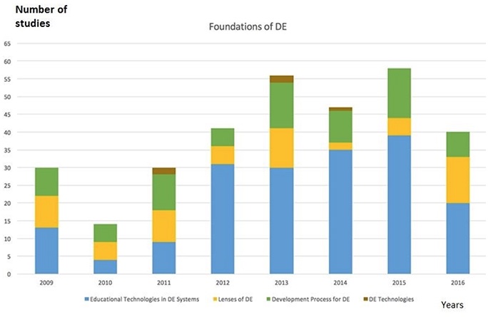 On the other hand, there is a significant decrease in the studies on the foundations of DE in 2016, yet only a gradual decline of the theoretical studies on DE. One of the reasons for the decrease in the number of these kinds of studies is that the necessary definitions have been previously provided and approved by the researchers and the new DE theories or models are less needed. No publications were published in the journals in 2016 covering the foundations of DE, in the subtopics of the characteristics of DE, historical foundations, and DE trends. At this point, it can be predicted that the issues related to the foundations may decrease in the following years. In 2016, in contrast to foundations, surprisingly, there was an increase in the subtopics of the status of DE in countries and communication/collaboration. These findings indicate that studies about the comparison of DE in different cultures and cultural integration may increase. Also, one can assume that new evaluations about interactions and communications techniques in DE will be addressed more after 2016.