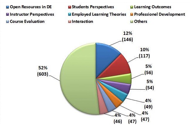 During the eight-year period, the most frequently studied subjects under the effects of DE applications level were found to be related to the student perspectives (n=117), followed by learning outcomes (n=56), and instructor perspectives (n=54). During this period, the topic of teaching practices (n=16) was found as the least studied topic. Similarly Davies, Howell, and Petrie (2010) pointed out that student perspectives were the most studied topic in DE. In the same study, the instructor perspectives theme was evaluated in the context of faculty issues and it was determined as one of the most frequently searched topic areas.,