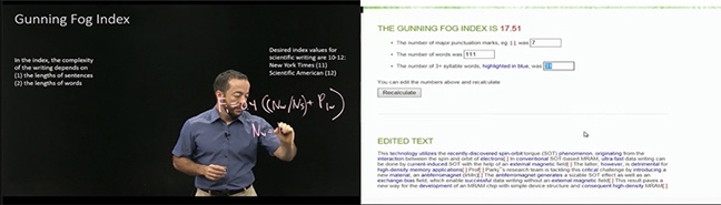 Figure 3. (Left) A still from the Treatment Group 3 video lecture (medium high diversity) that features the same text on the slide background as in the Treatment 1 and 2 versions along with Khan-style writing by the instructor. (Right) The Treatment Group 3 version of the video lecture includes the same visual shown in the Treatment 2 version.