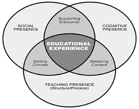 Stemming from Dewey’s emphasis on collaborative constructivism, Garrison et al. (2000) developed the CoI framework to build community in online environments. The CoI framework is the process of creating a meaningful learning experience through the development of three interdependent presences—social, cognitive, and teaching (Garrison et al., 2000). The CoI framework is currently becoming a concrete asset for creating online environments and thus meeting the issues online courses and programs are experiencing (e.g., the disconnect between students and their instructors, and students and their peers; Moskal, Dziuban, & Hartman, 2013; Slagter van Tyron & Bishop, 2009). The cognitive, social, and teaching presences work together in an overlapping, interdependent method to help students gain deep levels of community to support their individual learning (Szeto, 2015).