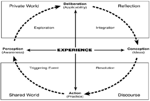 Cognitive presence, the ability to construct and confirm meaning through sustained reflection (Anderson, Rourke, Garrison, & Archer, 2001), is demonstrated in the Practical Inquiry Model (PIM) created by Garrison et al. (2000) and depicted in Figure 2. The PIM includes four phases: (1) a triggering event, where a problem is identified for further inquiry; (2) exploration, where an individual explores the issue; (3) integration, where learners concept meaning from ideas formed in the exploration phase; and (4) resolution, where students can apply the new skills and knowledge learned from the previous phases into real-world application(s) (Garrison et al., 2000). Reflection is a key aspect of the CoI framework and helps learners to increase their cognitive presence as Redmond (2014) states, “reflecting on learning content and outcomes relates to knowledge acquisition where learners identify their increased knowledge and skills in the subject area” (p. 50).