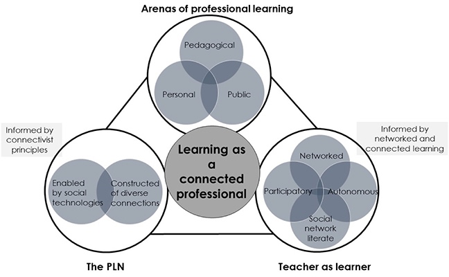 As a conceptual contribution, the model reveals a significant interrelationship between networked learning, connectivism, and connected learning. It shows how the attention to context (arenas of learning), the learner, and the PLN expand the notion of knowledge construction, distribution, and redistribution (Haythornthwaite & de Laat, 2012; Jones, 2015). By identifying the influence of diverse connections, interactivity, and autonomy, the model indicates the important role of connectivist principles in teachers' professional learning through PLNs (Downes, 2012). The openly networked nature of PLNs and the active, self-directed, and participatory attributes of teachers learning as connected professionals embodies the learning and design principles of connected learning (Ito et al., 2013).