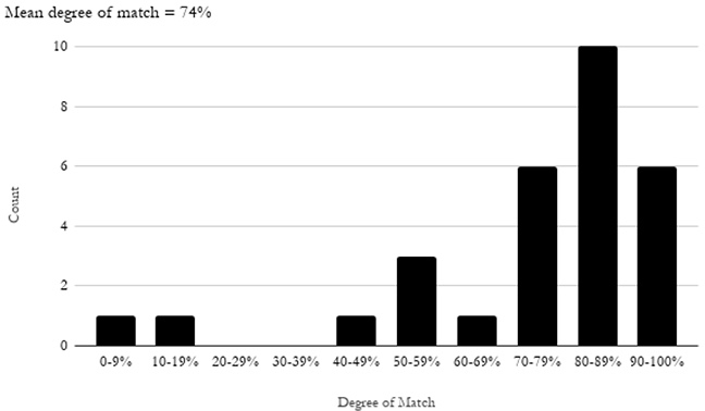 In general, the textbooks were well-matched to the courses. The mean degree of match was 74%, but this measure of central tendency may be misleading as two texts were particularly poorly matched to their respective courses (6% and 14%, respectively.) In general, textbook content was well-aligned with courses at the tertiary institution being studied, as demonstrated by the distribution of textbooks by degree of match (Figure 5.) The modal category is 80 to 89% match and a majority of textbook-course pairings (22 out of 29) fell within the top three categories.