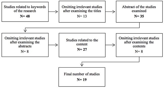 As shown in Figure 2, 48 studies were selected from the databases and evaluated. From among these, 19 were finally selected for analysis after several screening stages based on title, abstract, and content.