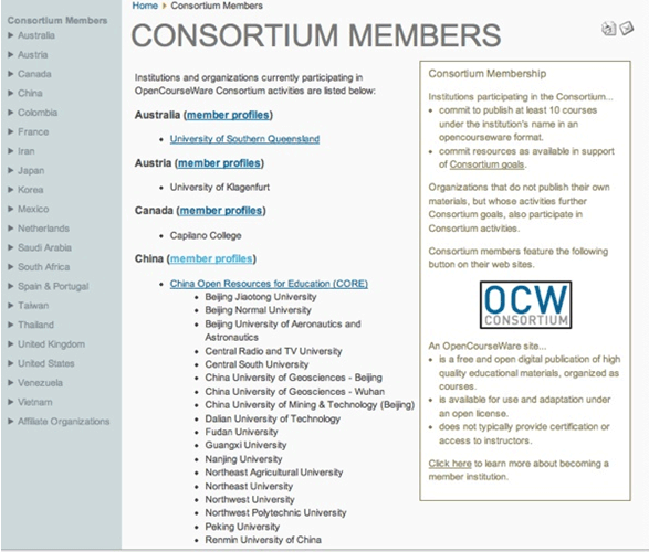 Figure 1. Image of the top portion of the OCW Consortium page of participants
