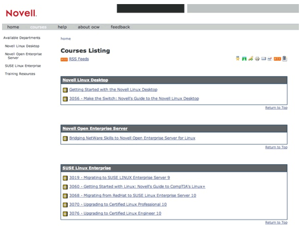 At least one business has entered the OCW arena by providing training and other educational materials under a Creative Commons license. Through its "Novell OpenCourseWare" site, Novell has published documentation, a knowledge base, and training materials (see Figure 2).