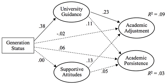 Data analyses were conducted using structural equation modelling (SEM) to test the study hypotheses. Regarding generation status and family resources, the authors anticipated that first-generation students would report less university guidance compared to continuing-generation students, while no hypothesis was made regarding generation status and family attitudes. Regarding family resources and academic outcomes, the authors anticipated that university guidance would be a stronger predictor of academic adjustment than would supportive attitudes, while supportive attitudes would be a stronger predictor of academic persistence than would university guidance.