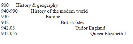 The problem unit is ‘Classification,’ specifically, instruction in the Dewey Decimal Classification System. Perhaps viewed by some as arcane in the online environment, the Dewey system does have its uses, particularly in the K-12 school library environment. Although revised over many editions, the classification system remains a classic example of ‘nested’ or ‘embedded’ information. For example, a book about Queen Elizabeth would be placed in the classification number 942.055. Each number more thoroughly defines the detailed placement of the book and its relation to other books. That portion of the Dewey schedule shows the following: