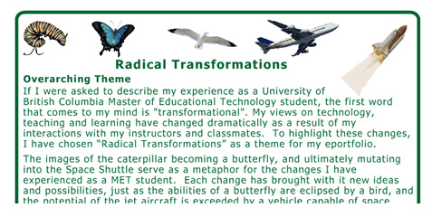 MS used a set of images to describe the process of transformation: a caterpillar to butterfly, seagull, airplane, and shuttle (Figure 1). Some transformations were not a natural maturation and growth process (evolutions), but rather a ‘forced’ metamorphosis – bird to airplane and shuttle. MS used a word “mutating” to express the “radical transformation”. We knew from his biographical pieces, that MS decided to make a change in his career and move from business and technology areas into social sciences and learning. His belief in behaviourist approach started shaking under the influences of constructivist theories he encountered in the MET program, particularly as he examined the social implications of technology. Although it may look that MS’s metaphors were too strong to relate to his learning experience, one may wonder about his interpretation of being radical.