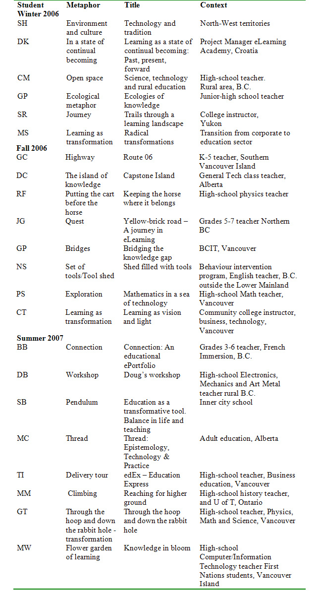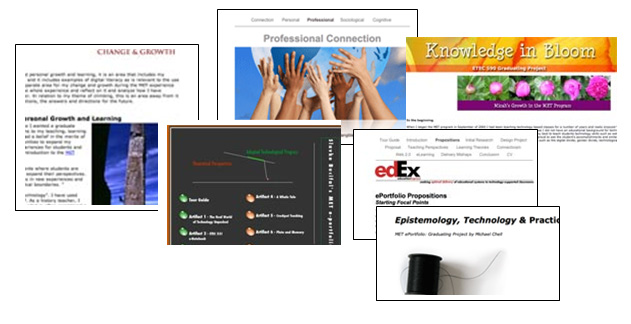 The research reported here is based on the analysis of ePortfolios, which had been constructed as a part of an elective course, ETEC 590 (most often taken as the last course) in the MET program. The course had been taught four times and the data collected for this paper was based on the consent of 22 students (n =17 males; n = 5 females) who agreed to have their materials analyzed for this paper and their ePortfolios posted as examples for new students taking the course. The course has gone through major revisions based on students’ feedback and the analysis that had been the basis for this paper. ETEC 590 is an online course which includes course content materials, group discussion forums posted on the course website, and a blog. Strategies for peer and instructor feedback are built into the course at various points. The major task for each student taking the course is to construct an ePortfolio.