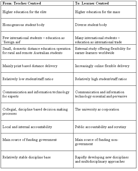 A range of environmental factors1 has challenged the Australian higher education sector over the last decade. Globalisation of the economy, changing patterns of work and employment and the emergence of the knowledge economy have changed demands for education from elite to mass, while at the same time giving rise to increased labour market inequalities and thus, access to goods and services by certain sectors of society.2 Changing demographics arising from changes in birth rates and patterns and levels of migration mean that Australia, like other Western nations, is experiencing the effects of ageing populations and changes in the dependency ratios (ratio of workers to non-workers). Communication and information technologies have become pervasive, changing the nature of work and enabling communication and business to occur regardless of time of day or country in the world. Government funding of higher education has been reduced substantially, meaning that institutions have had to develop new sources of income and become more transparent and responsive to their new or changing clienteles. Business and education are increasingly borderless, demanding new levels of cultural literacy as participants communicate and engage across cultures and languages. The changes are summarised, albeit in simplified form, in Table 1 below.