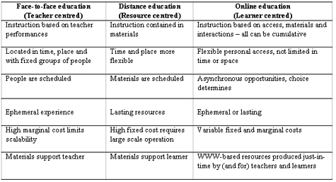 Application of a professional development model and parallel shifts provided the impetus for the development of online teaching and learning. This development has blurred the boundaries between on-campus and distance teaching and learning approaches and has given rise to hybrid arrangements, which challenge the assumptions behind on campus (face-to-face) and traditional distance education. A convenient characterisation of hybrid situations is "online education" as it may be resource-based learning used by on-campus students (and combined with face-to-face teaching) or, equally, used by off campus students (with or without face-to-face components) studying the same course. Where the information and communication capacities of online technologies are fully exploited, it is possible to characterise this as a new mode with distinctive assumptions and differences from on and off campus teaching.