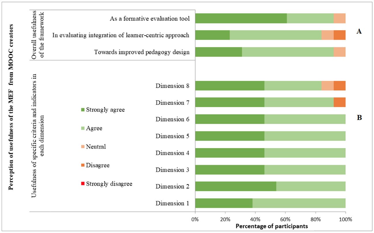 We focused on our first research question through quantitative analysis of usability and usefulness of the MEF for MOOC creators. The average equivalent score for the scale of usability for all participants was 78.46. Hence, based on the mean system SUS scores rating (Bangor et al., 2008), MOOC instructors classified the MEF as “good” in terms of its usability. There was a high level of agreement observed in the perception of usefulness for each dimension, ranging from 84% to 100% (average 97%). MOOC creators also showed a strong positive perception of the use of the MEF in: (a) evaluating integration of learner-centric approaches in MOOCs (84%); (b) employing the framework as a formative evaluation tool (92%); and (c) bringing a positive change in pedagogy design of MOOCs (92%). These results, shown in Figure 4, were based on the experience of participants with the framework while evaluating their own MOOCs.