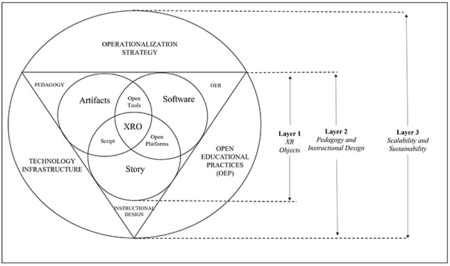 The OXREF comprises three layers: (a) open XR object creation, (b) pedagogy and instructional design input, and (c) scalability and sustainability for a holistic approach to creating fully fledged open XR experiences, from conceptualization to deployment and beyond. The three layers of the OXREF are shown in Figure 1.