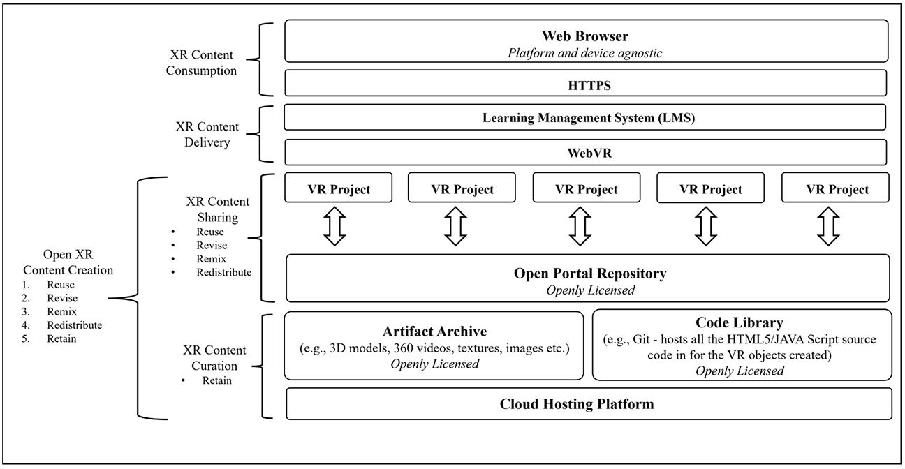 When considering technology, both scalability and sustainability of educational technology projects heavily depend on (a) establishing productive partnerships among stakeholders, (b) identifying research-informed approaches to technology integration that are sustainable and scalable, and (c) developing sustainable and scalable approaches to technology integration (Niederhauser et al., 2018). XR content, including the artifacts, software code, and scripts among others, should be hosted and served using a FOSS architecture that adheres to OEP and open licensing. This enables the XR content to be reused, revised, remixed, redistributed, and retained for multiple projects within the same institution as well as collaborative projects across multiple institutions. Figure 4 identifies a technology infrastructure architecture which will be used for open XR content hosting, content reuse, content delivery and content consumption in the OXREF.
