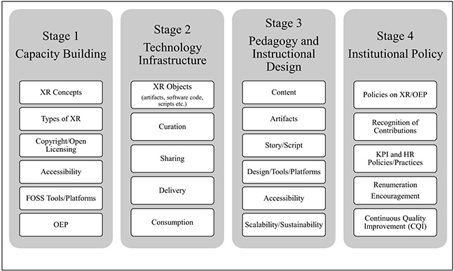 Based on the work by Abeywardena (2012) and Abeywardena et al. (2019), Figure 5 outlines a four-stage operationalization strategy for the OXREF in an educational institution. Stages 1 to 3 have been discussed in detail in the preceding sections. Stage 4 addresses the need for institutional policy governing the use of XR in teaching and learning from several perspectives.
