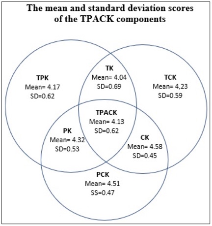 In presenting our results from the survey, first, the scores from dimensions of TPACK are described, and then relationships between the scores in the dimensions and variables are addressed. In general, instructors were found to have consistently high levels of perceived knowledge in all TPACK domains.