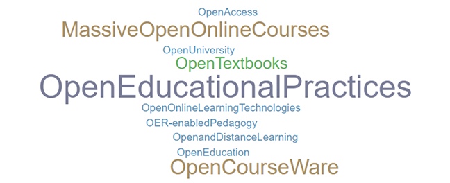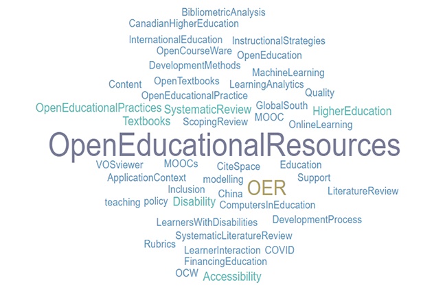 Furthermore, the systematic reviews mentioned 10 other open terms in their titles, abstracts, and keywords besides the term open educational resources, which appeared 24 times and, as it is the focus of this study, it was not introduced in the word cloud below. Open educational practices was mentioned five times, massive open online courses and open course ware appeared three times, and open textbooks appeared twice. The other terms, as displayed in Figure 4, were mentioned only once.