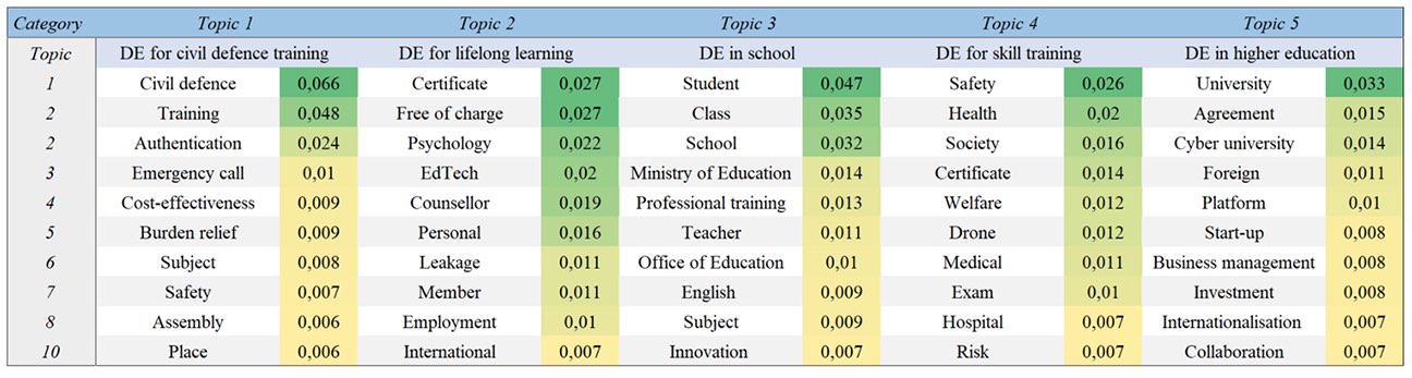 Topics 2 to 5 were concerned with ODE provisions at different levels of education—Topic 2, lifelong learning; Topic 3, school learning; Topic 4, advanced skill training; and Topic 5, higher education. The extracted keywords and associated news articles on each topic revealed the meaningful differences in the public discourses concerning ODE provisions in different educational contexts. For example, in lifelong learning contexts, participating in ODE often provided internationally recognised certificates (a psychological counsellor certificate being the most frequently mentioned in the news articles). Along with the increased number of open courses, there were conversations about some of the DE programmes being free of charge though those programmes experienced security problems, including leakage of the personal information of their members.