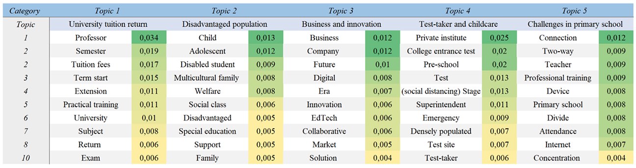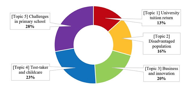 Unsurprisingly, with the outbreak of COVID-19 in January 2020, the number of news articles concerning ODE provisions increased dramatically (from 239 in 2019 to 6,504 in 2020). ODE quickly gained its normality, legitimacy, and necessity across all educational sectors in Korea. The five topics identified in the 2020 news articles can be found in Table 3—university tuition return (movement), disadvantaged population, business and innovation, test-taker and childcare, and challenges in primary school.