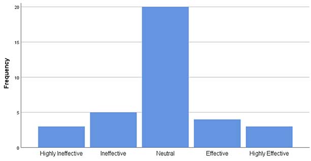 Teachers were asked to evaluate their OLPE teaching effectiveness on a scale from one to five (Figure 4). Most teachers (57.1%) placed themselves in the middle of the scale, at three.