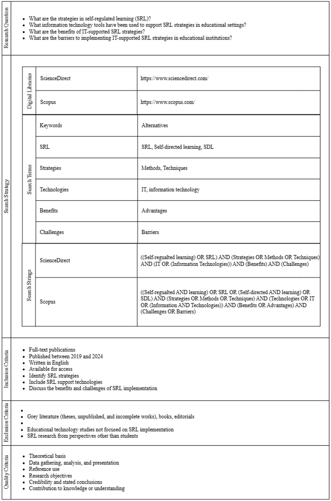 By addressing these gaps, this study aims to advance the understanding of SRL by systematically reviewing and synthesizing existing research on SRL strategies, supporting technologies, benefits, and challenges in digital education. This integrated approach provides a more comprehensive framework for educators and policymakers to implement effective SRL practices tailored to the nuances of digital learning. The research questions are as follows: