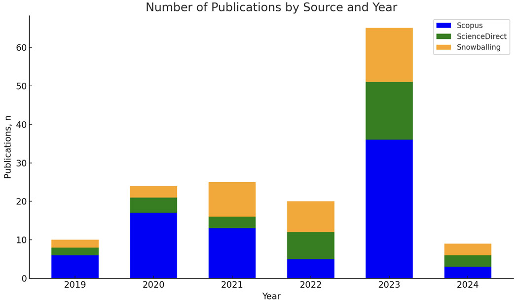 Figure 2 provides a summary of the articles used for analysis, categorized by year of publication and database. The data reveal that 2023 had the highest number of publications, totaling 36 research articles, with 15 articles from ScienceDirect, 14 from Scopus, and 7 obtained through the snowballing process. Conversely, 2024 had the lowest number of publications, with a total of 6 articles, equally distributed between ScienceDirect and Scopus, each contributing 3 articles. However, as the year 2024 is still in progress, this is expected to change.