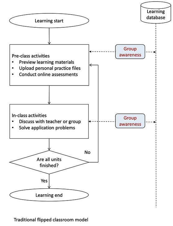 This study proposes a teaching model called “flipped classroom combined with group awareness” (FC+GA) to address the challenge of student preparedness in a traditional flipped classroom (FC) model setting. The FC+GA model incorporates group awareness tools, which provide visual information such as statistical tables and graphs, that allow students to see their online learning status along with that of their peers. By using these tools, students can have a better understanding of how well-prepared they are compared with their peers. This knowledge can motivate them to improve their efforts to prepare before class. The study conducted an extended experiment to analyze the effectiveness of the FC+GA model compared with the traditional FC model. The results show that the FC+GA model significantly improves students’ preparation efforts before class and enhances students’ learning outcomes. The study therefore concludes that the FC+GA model can be used as a practical reference and model for instructors preparing to implement flipped classrooms.