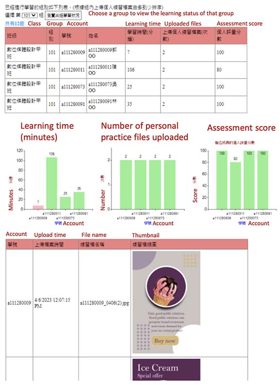 The table in the top part of Figure 2 provides a detailed overview of each group member’s learning activities. This includes information such as (1) the amount of time they spent on learning (in minutes), (2) the number of practice files they have uploaded, and (3) their scores achieved in the online assessment. This table offers a comprehensive view of the engagement and performance of each group member. The charts in the middle part of Figure 2 display three corresponding learning activities. These charts present graphical representations of the three key aspects of learning, allowing students to easily compare and analyze their progress in relation to that of their group members. The visual nature of the charts makes the data easier to access and interpret, helping the students to identify patterns and trends in their learning activities. The table in the bottom part of Figure 2 provides detailed information about the personal practice files uploaded by group members. This information includes the upload time, file names/types, and thumbnail previews of the practice files. This can facilitate knowledge-sharing within the group, as well as inspire ideas for their own learning practices.