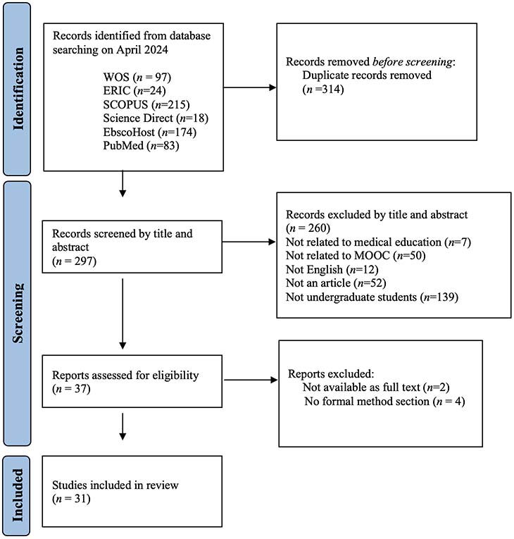 After the initial screening, 351 articles were excluded because they were not (a) related to health education, (b) focused on MOOCs, (c) written in English, (d) journal articles, or (e) centered on undergraduate students. This process left us with 37 reports for full-text assessment. Of these, six reports were excluded because two could not be accessed in full text, and four lacked a formal method section. Consequently, 31 studies were included in the final review for synthesis (Figure 1).