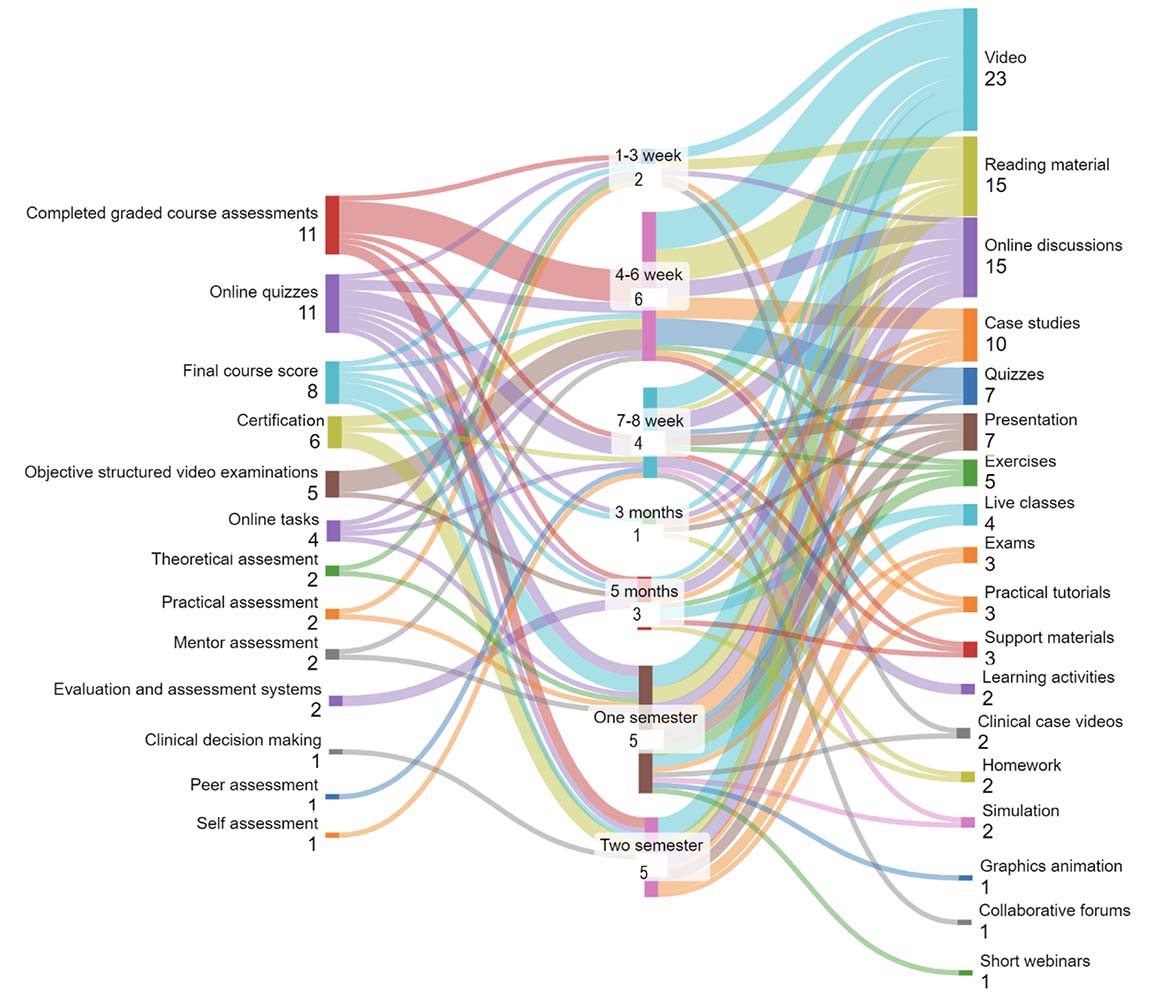 In the one to three week range, video (n = 2) and reading material (n = 2) were the course materials used most often, with different assessment types being used. In the four to six week range, completed graded course assessments (n = 6) and objective structured video examinations (n = 4) were the most common assessment types, while video (n = 7), reading material (n = 6), and quizzes (n = 5) were the materials used most. For courses in the seven to eight week range, online quizzes (n = 3) were the most common assessment type, while video (n = 4) and online discussions (n = 3) were the materials used most. In the three-month range, a range of different assessment types and materials were used equally. In the five-month range, evaluation and assessment systems (n = 2) were the assessments used most, with live classes (n = 2) and online discussions (n = 2) the materials used most. For one semester courses, final course scores (n = 3) and video (n = 4) were used as assessment types and materials, respectively. In the two-semester range, certification (n = 3) and video materials (n = 4) were the most commonly used.