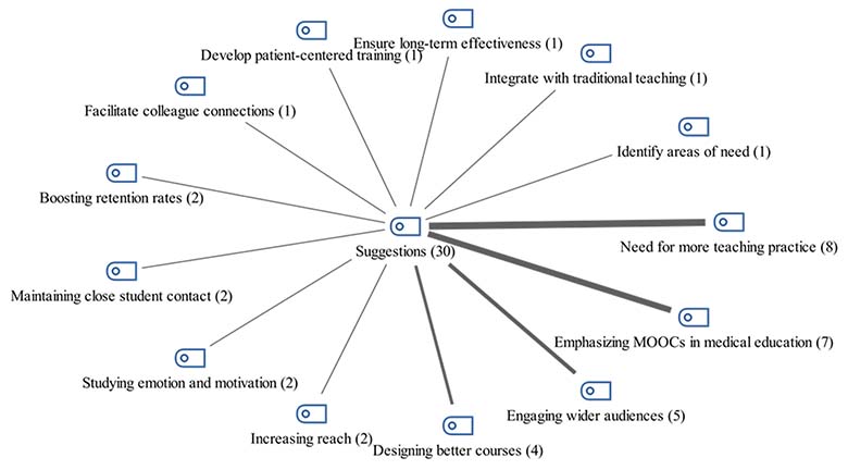 The suggestions in the studies on using MOOCs in health education were analyzed, and a general distribution was created (see Figure 10). The most common suggestion was the need for more teaching practice (n = 8). Other suggestions included emphasizing MOOCs in medical education (n = 7), engaging wider audiences (n = 5), designing better courses (n = 4), increasing reach (n = 2), studying emotion and motivation (n = 2), maintaining close student contact (n = 2), and boosting retention rates (n = 2). Additional suggestions are outlined in Figure 10.