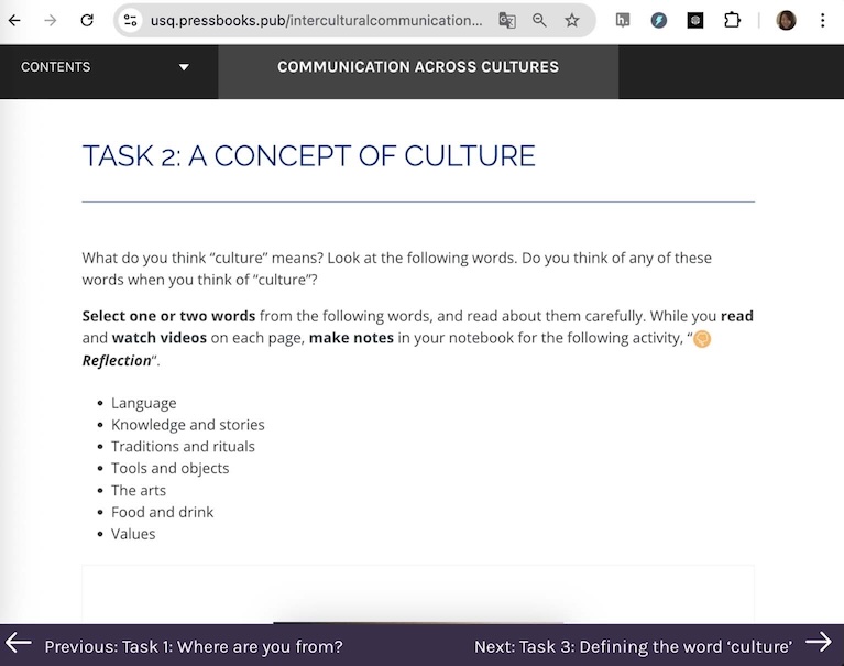 This is the philosophy which underlies the design of an OER book titled Communication Across Cultures (Chang et al., 2025), which has the aim of tackling linguistic, cross-cultural, and digital literacy issues, initially for refugees and asylum seekers participating in English for academic purposes programmes in an Australian university. While the resource provides opportunities to practise and develop relevant language skills, its primary concern lies in supporting cross-cultural communication. This is achieved through activities that prompt reflection on users’ own cultural identities and their perceptions of others, thereby cultivating intercultural awareness and competence (Liddicoat & Scarino, 2013). Recognising that levels of digital literacy among users will vary, opportunities for practising, acquiring, and developing aspects of digital literacy are also embedded in the OER design (Getenet et al., 2024). Intercultural understanding and digital literacy are central to equipping learners for meaningful participation in increasingly globalised and digitally mediated environments.