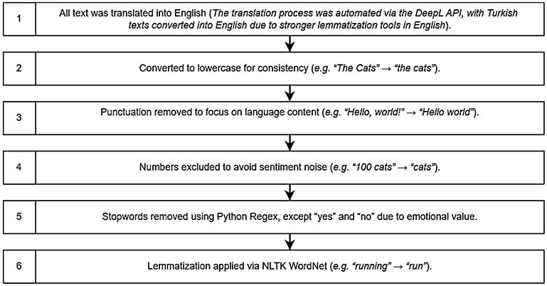 Data preprocessing involves a series of operations performed on a dataset prior to the sentiment extraction phase. Our preprocessing steps, illustrated in Figure 1, aimed to prepare the data for model training and testing, ensuring the model would be both understandable and reliable.