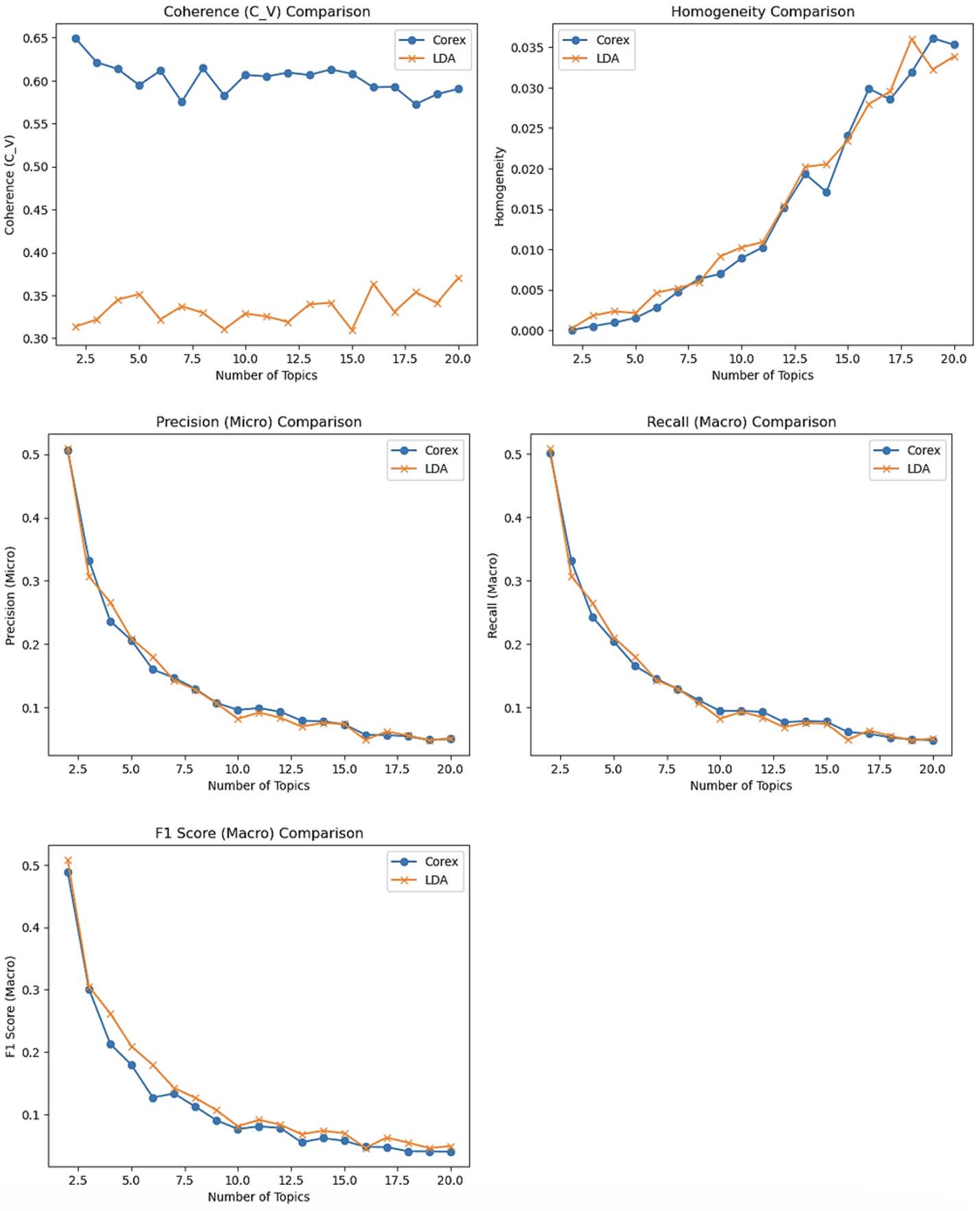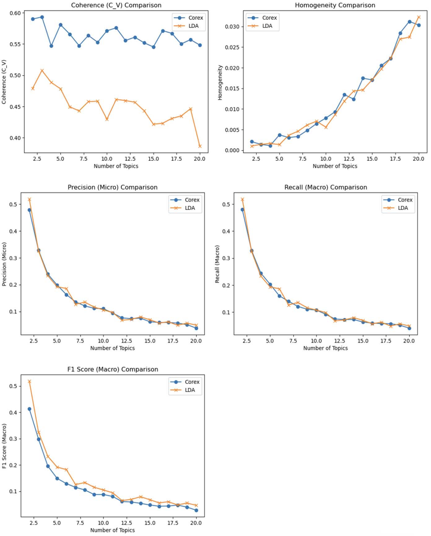 CorEx and LDA were compared to identify latent topics, evaluated by coherence, homogeneity, precision, recall, and F1 (see figures 2 and 3). Detailed findings are explained in the following sections.