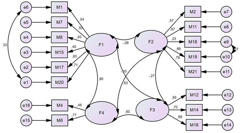 The data were analysed using Statistical Package for Social Sciences for Windows 25.0 and Analysis of a Moment Structures. In pursuit of the reliability analysis, the Kaiser-Meyer-Olkin (KMO) measure of sampling adequacy was calculated and found to be 0.812, indicating that the sample was adequate for factor analysis. In addition, results of the chi-square value were recorded to be significant (χ2 (120) = 1034.443; p < 0.01) according to the Bartlett Sphericity test, confirming that the correlations between items were sufficiently large for factor analysis. An explanatory factor analysis was conducted using principal components analysis and varimax rotation methods (Browne & Cudeck, 1993). Survey items 3, 5, 9, and 13 were excluded due to overlapping loadings, and item 10 was removed because its total item correlation was below 0.30. The final four-factor solution accounted for 61.8% of the total variance. As for the confirmatory factor analysis, the structural equation modelling results were significant at the p = 0.000 level, with 16 items loading onto four factors. Model fit was further improved by allowing covariances between error terms with high modification indices. The goodness of fit index (GFI) was 0.852, indicating an acceptable model fit. In conclusion, the scale was confirmed to provide construct validity (X2/SD = 2.723; RMSEA = 0.098; CFI = 0.826; AGFI = 0.791; NFI = 0.756; IFI = 0.830; TLI = 0.783).