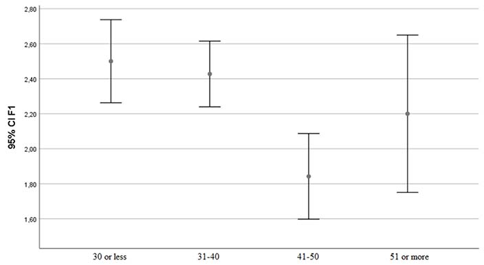 As for the second research question (see Appendix), a statistical difference was not detected among any of the factor values and participants’ gender, similar to Akdeniz (2022), Dişli (2020), and Machida (2016), but different from Eren (2020), and Gürsoy and Korkmaz (2018). On the other hand, the Appendix displays a significant difference between F1 scale rates according to participants’ ages, similar to Kralova and Tirpakova (2019). In addition to the chart in Figure 2, which demonstrates F1 mean rates and range according to age groups, the Bonferroni test also revealed that the rates of participants aged 30 or below and 31 to 40 were higher than those aged 41 to 50. This finding implied the significance of seniority, indicating that the younger the educators were, the less their perceived competence (Aydın & Uştuk, 2020; Dişli, 2020; Eren, 2020).